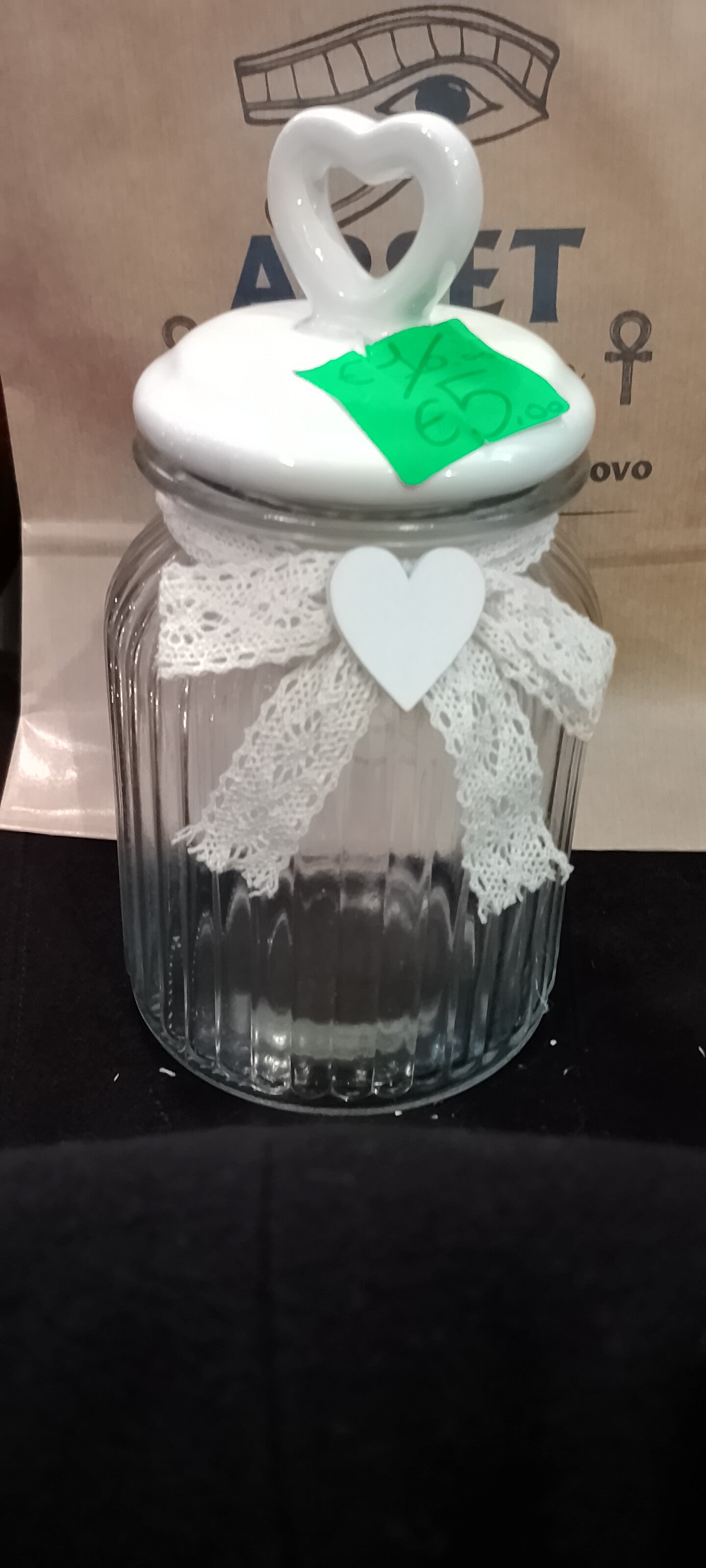 Barattolo in vetro stile shabby con ricamo bianco e tappo in ceramica salva freschezza.