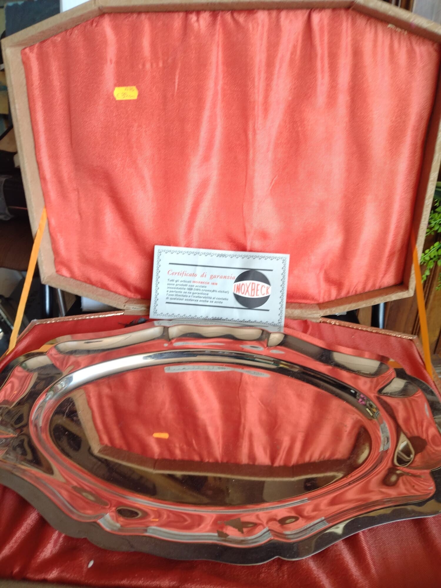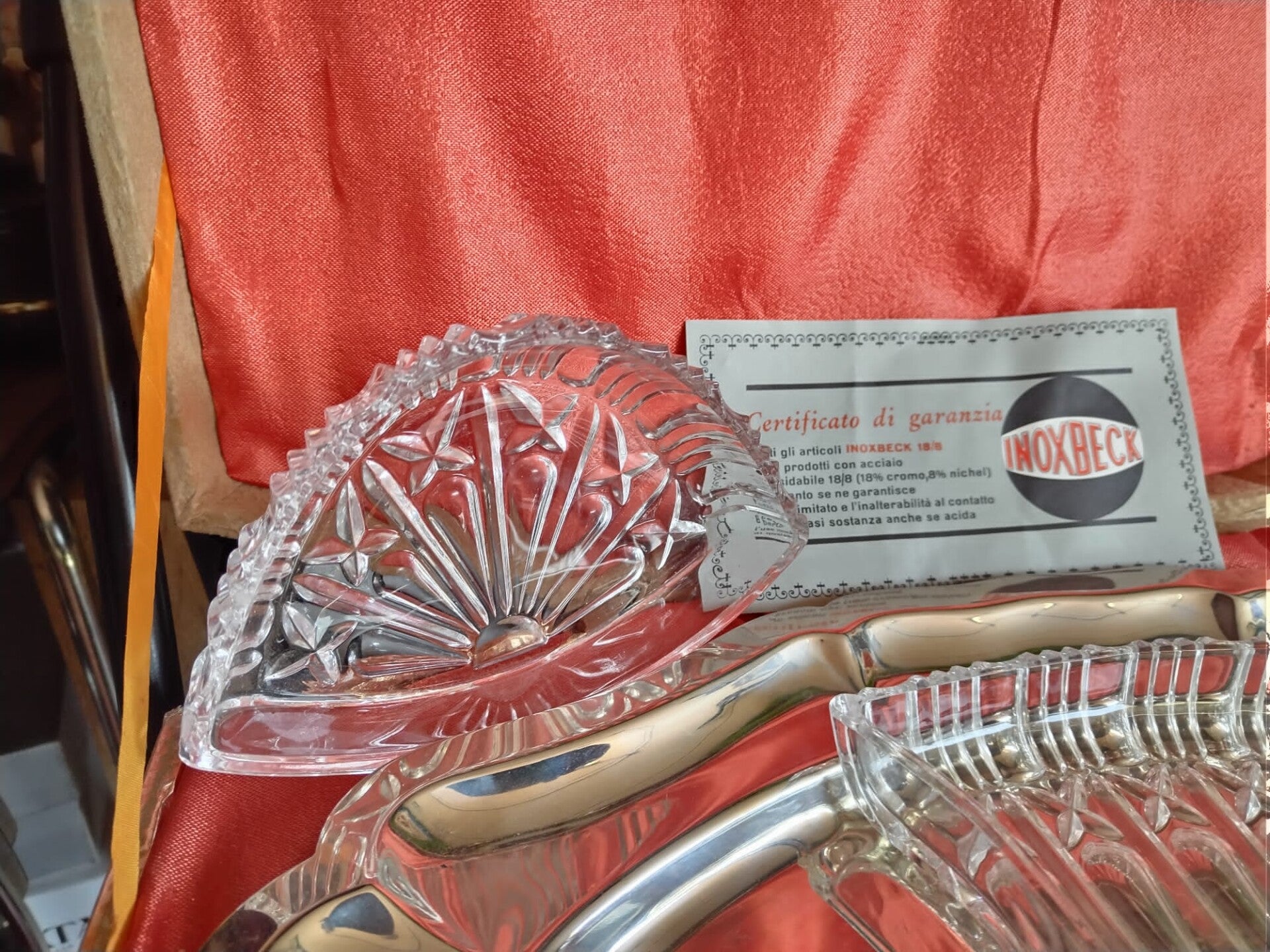 Servizio composto da confezione regalo completa di vassoio inox 18/8 e n 4 piatti in vetro decorato. Misura lunghezza 40 cm larghezza 28 cm.