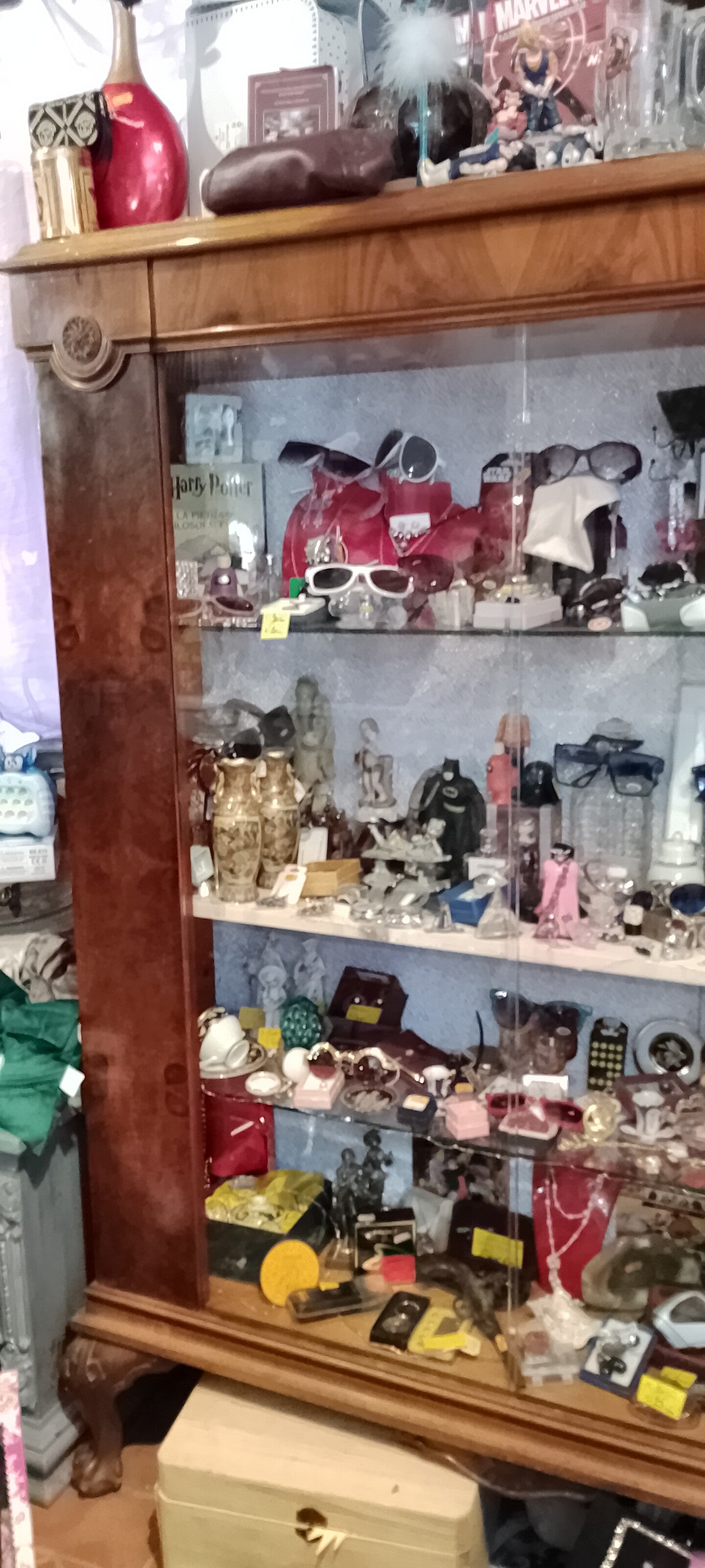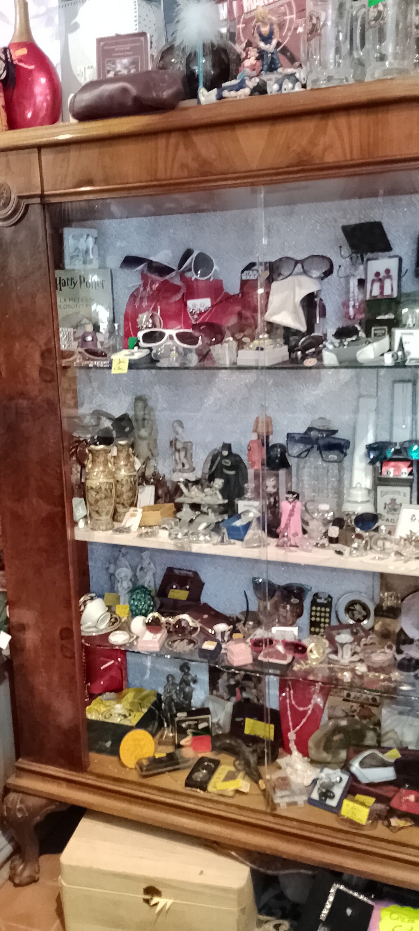 Vetrina in legno con n 3 ripiani in cristallo un ripiano è stato fatto in legno. Misure lunghezza 1.35 altezza 1.80 Profondità composta da n 3 ripiani, solo un ripiano è in legno.