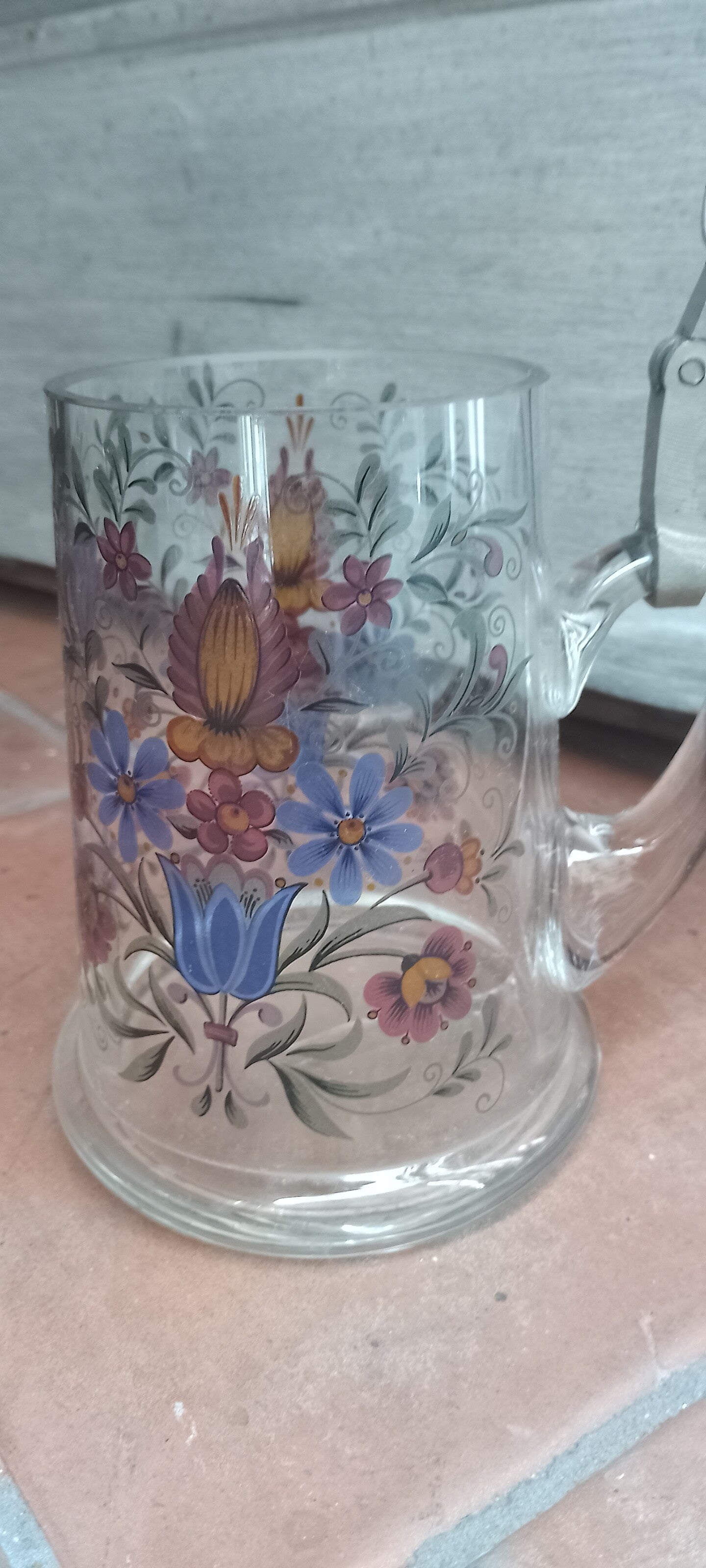 Boccale in vetro lavorato con coperchio in peltro, purtroppo il vetro risulta leggermente scheggiato internamente.