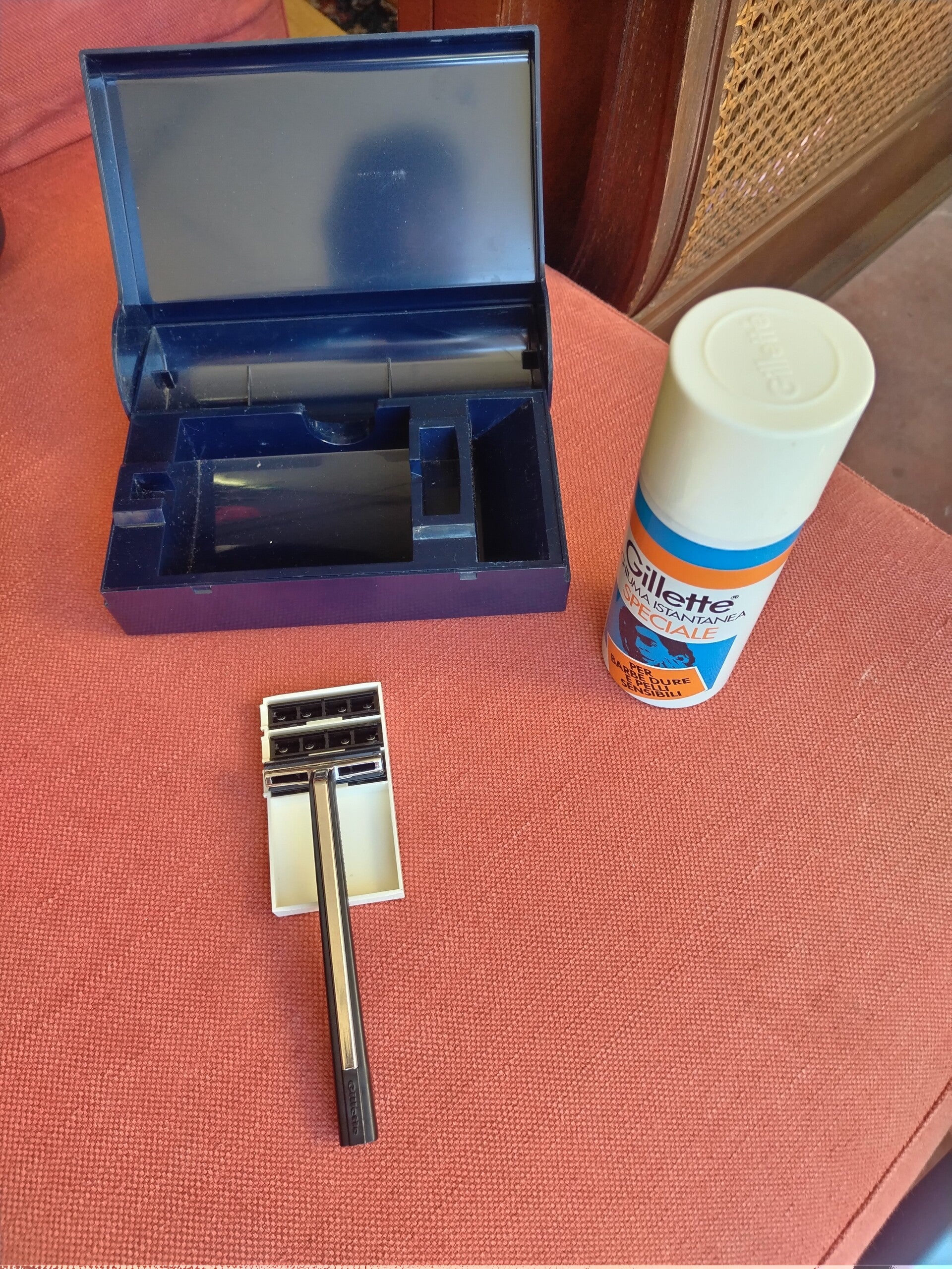Gilette completo di rasoio manuale e schiuma istantanea speciale per barbe dure e pelli sensibili .
