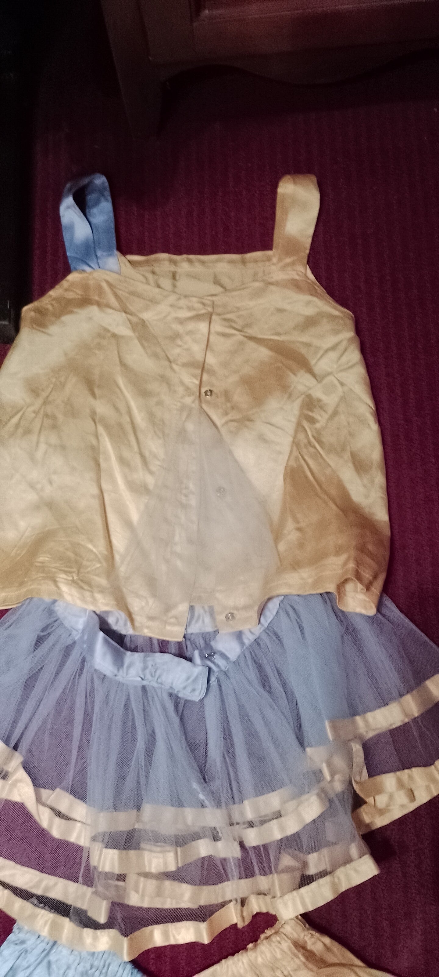 Costume composto da pantalone lunghezza 76 cm gonnellina con clips e canotta con bottoni misure lunghezza 38 larghezza 41. Prodotto pari al nuovo