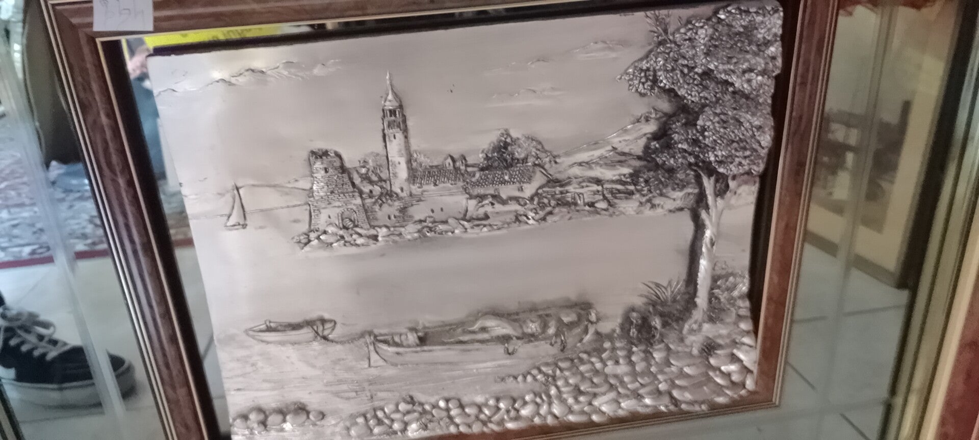 Quadro con specchio e lastra lavorata bagno d argento, misura 70x60.