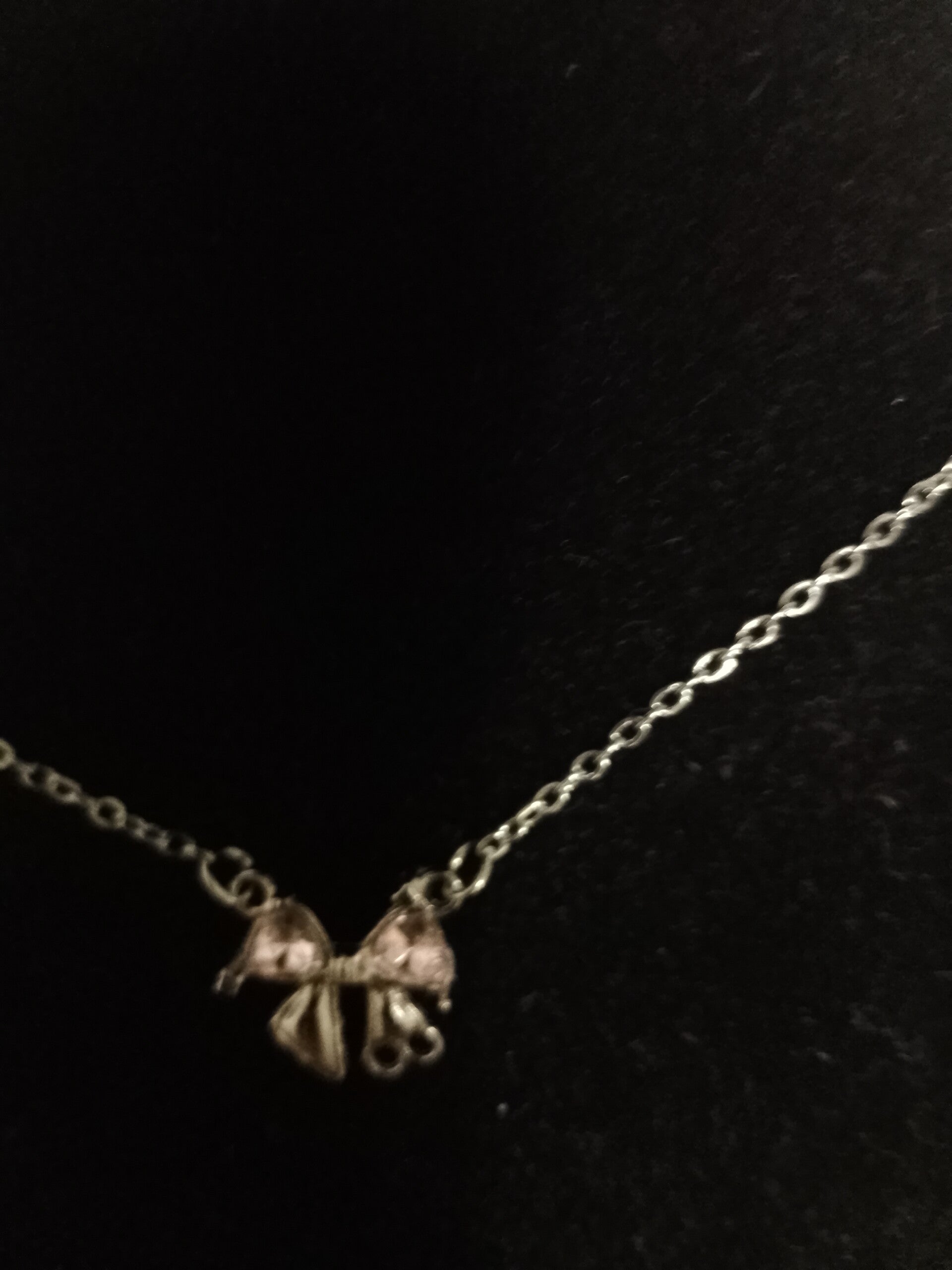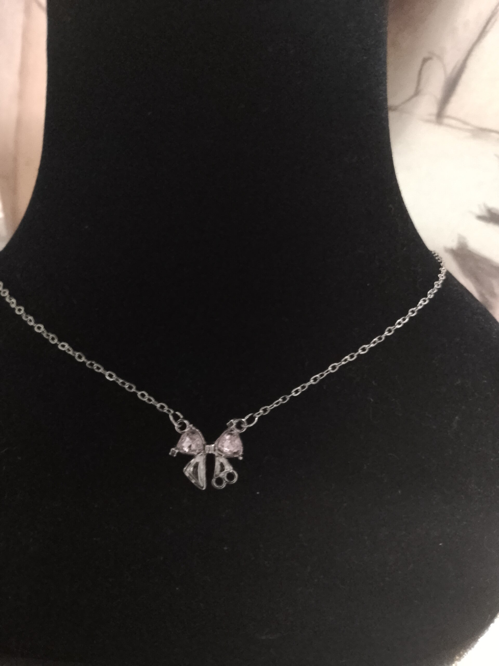 Collana con ciondolo a forma di fiocco rosa.