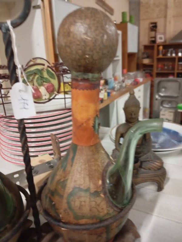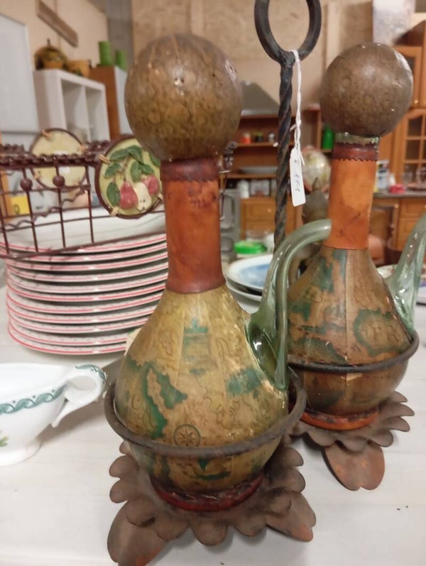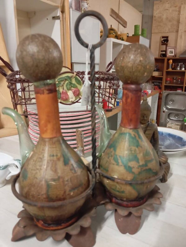 Olierà vintage bottiglie rivestite in pelle e lavorate base in ferro battuto