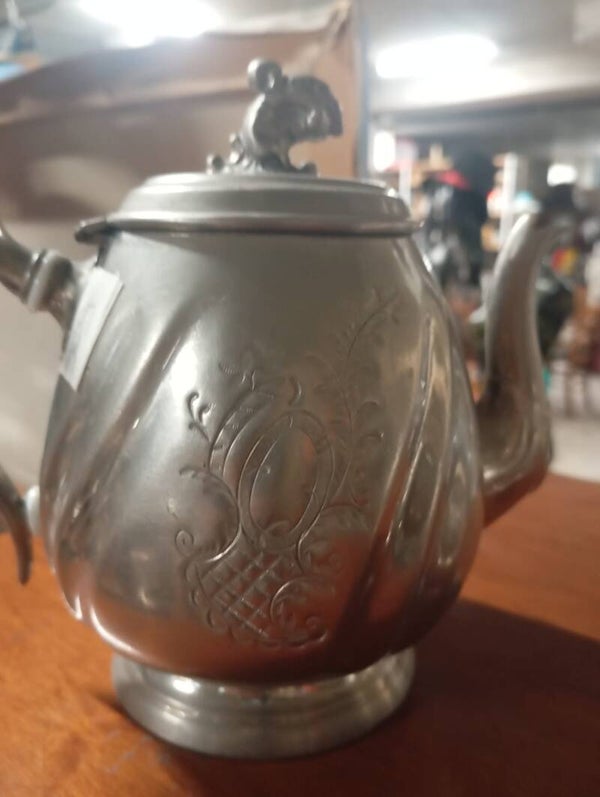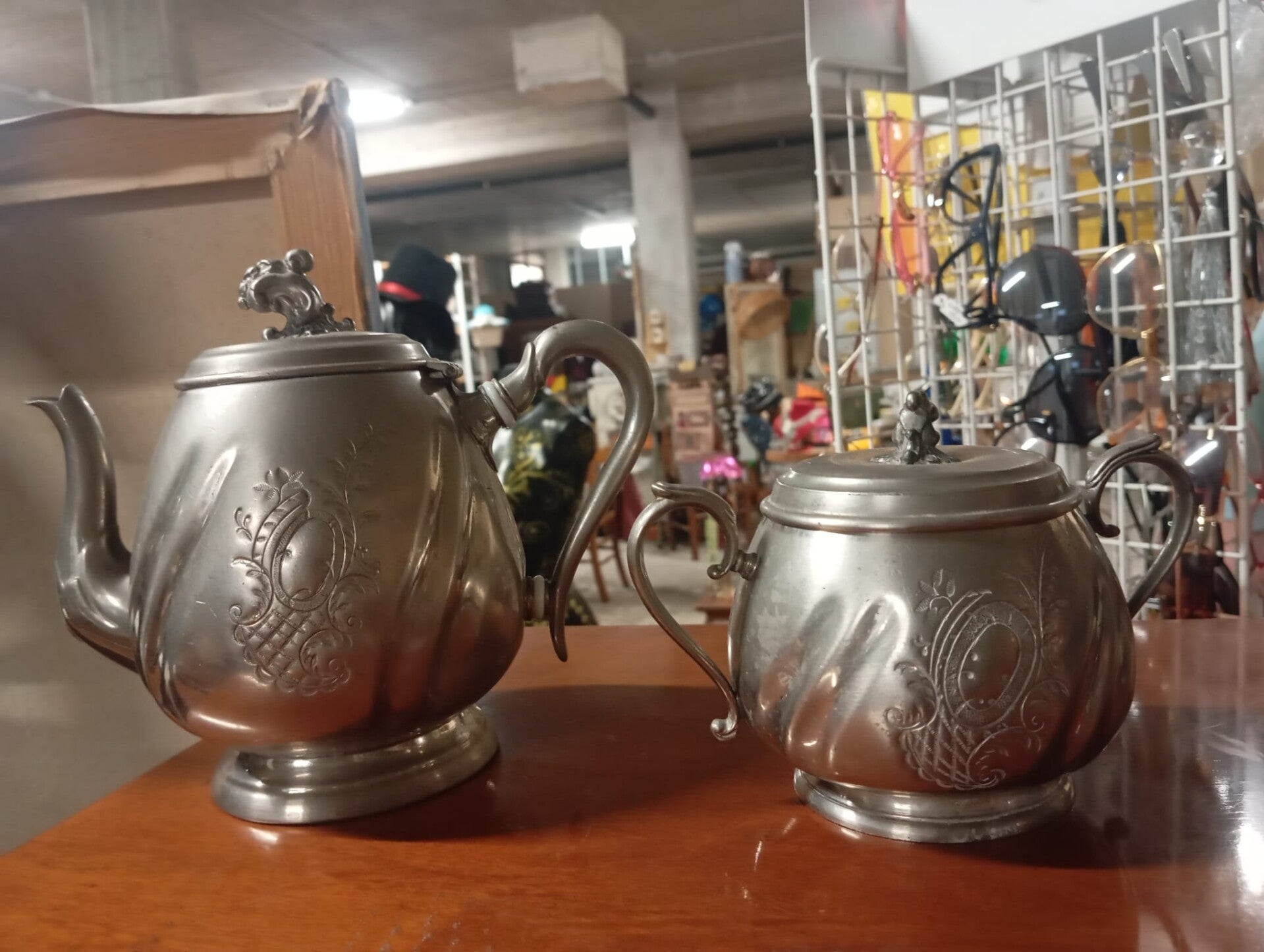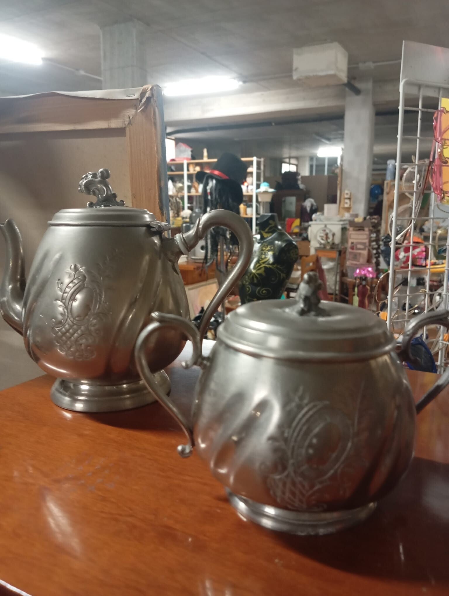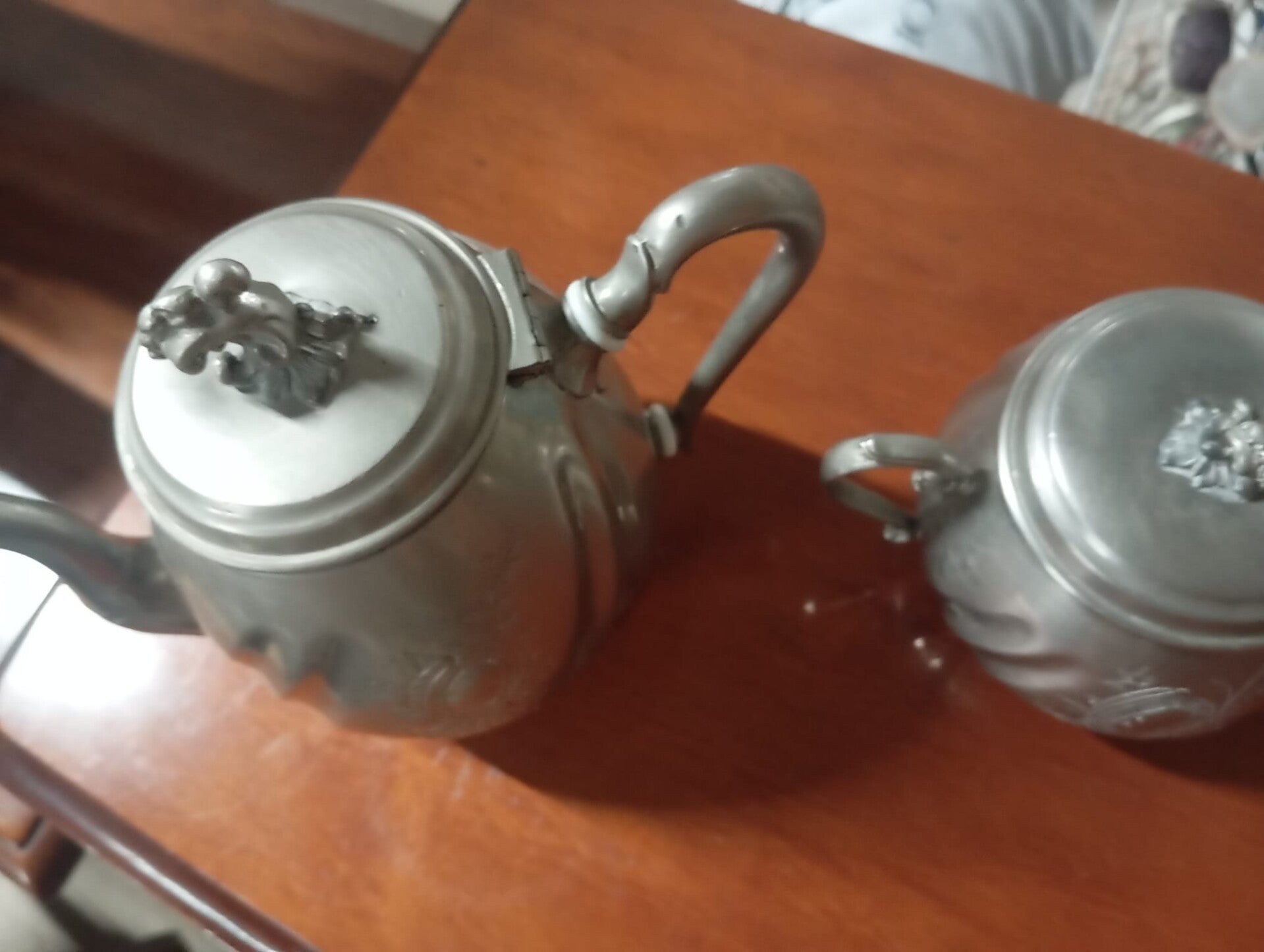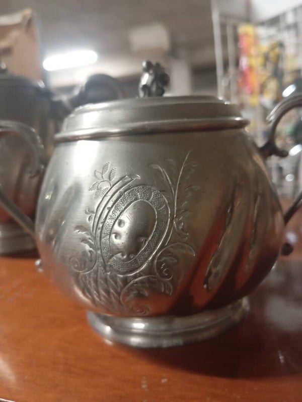 Servizio completo di zuccheriera e teiera in peltro. Misure teiera altezza 16 larghezza 19.