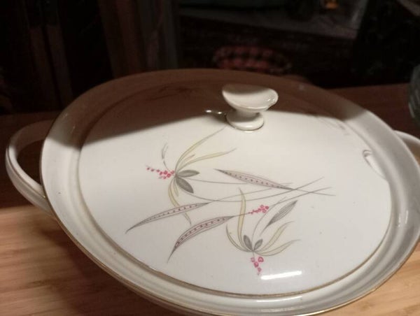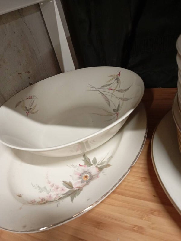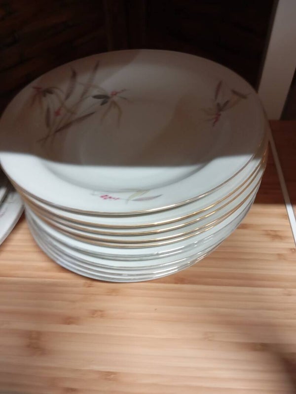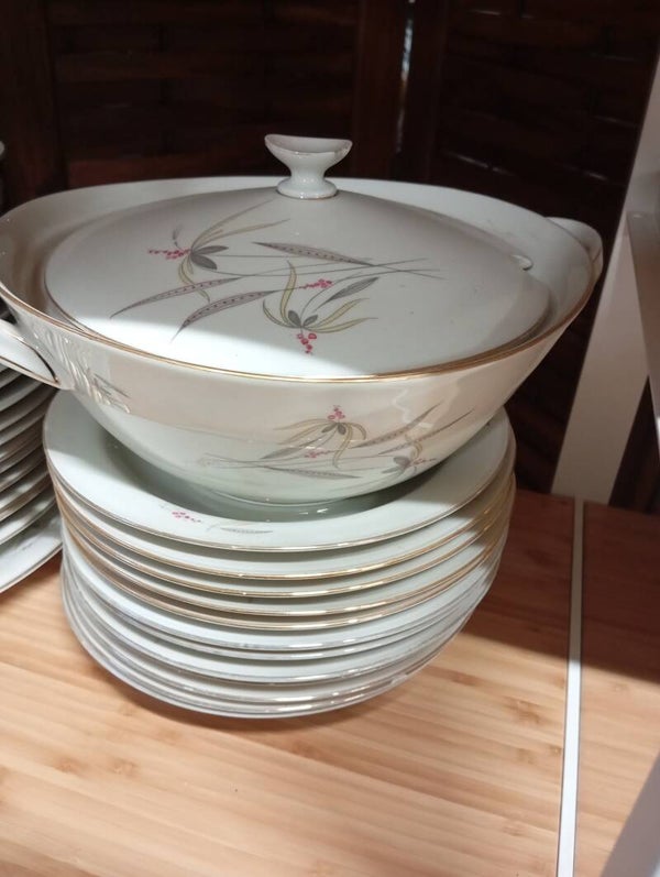 Servizio piatti in buone condizioni composto da n 1 insalatiera n 1 piatto ovale medio n 1 piatto ovale piccolo n 1 piatto da portata rotondo n 12 piatti fondi n 1 zuppiera con il pomello leggermente sgusciato n 12 piatti piani n 10 piatti frutta.