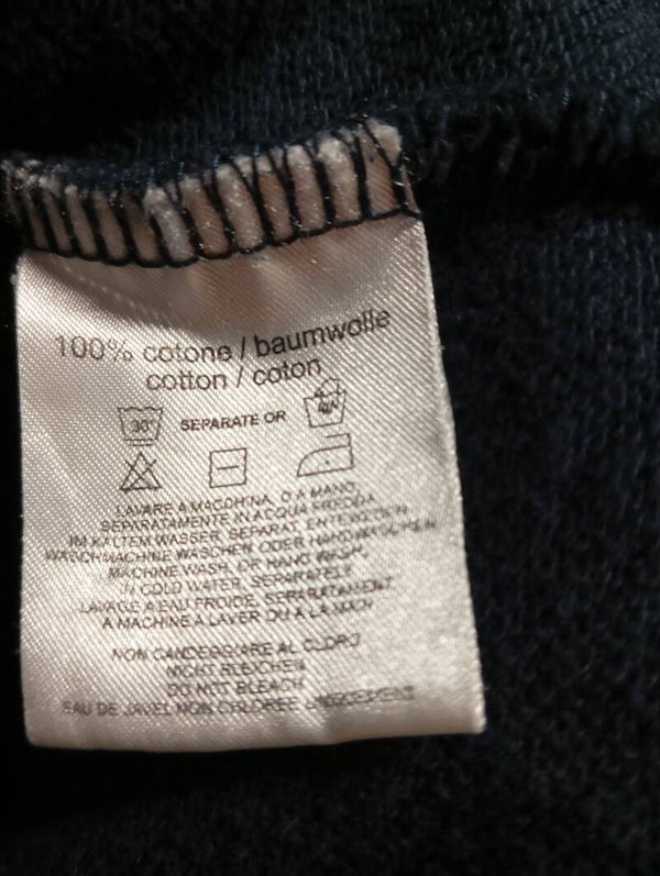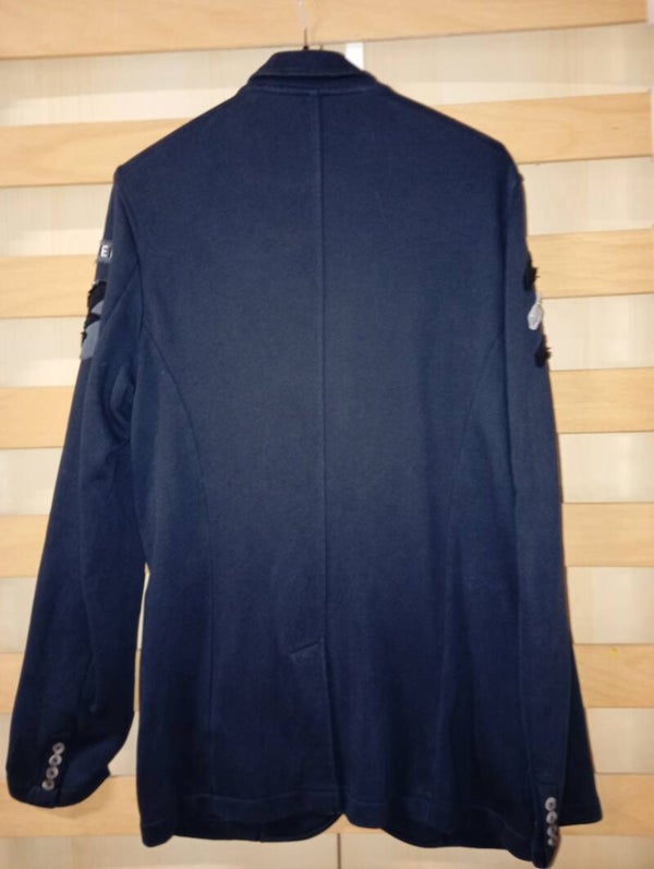 Giacca uomo con bottoni colore blu scuro e stampe cucite in tutta la giacca. Taglia M.