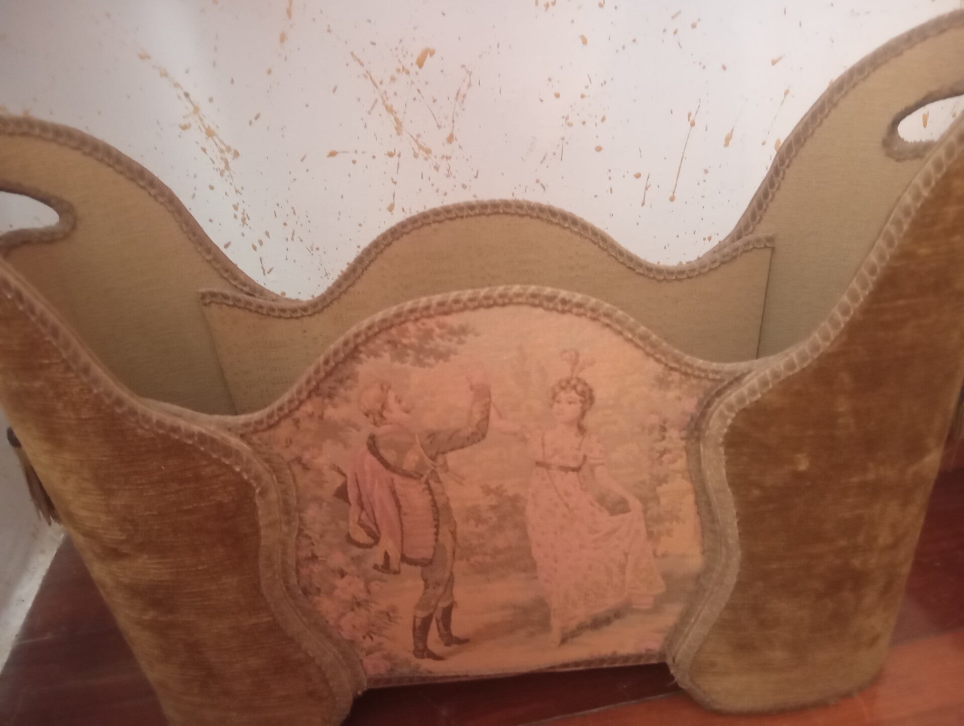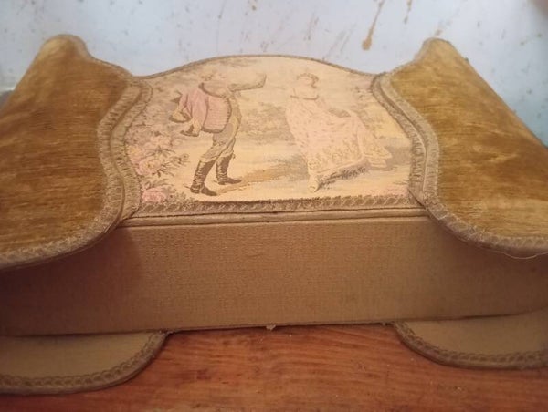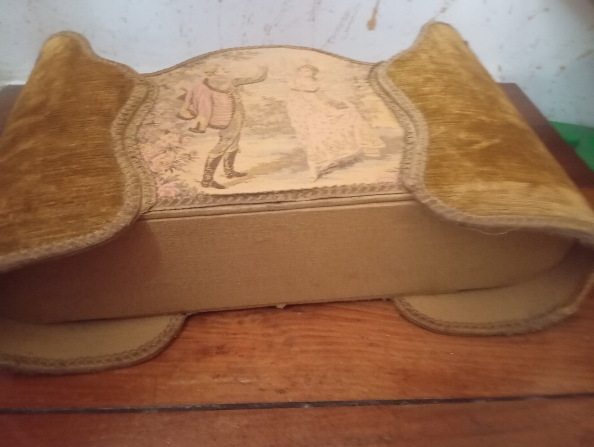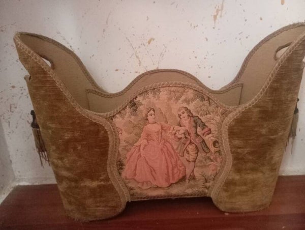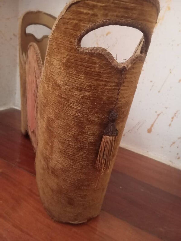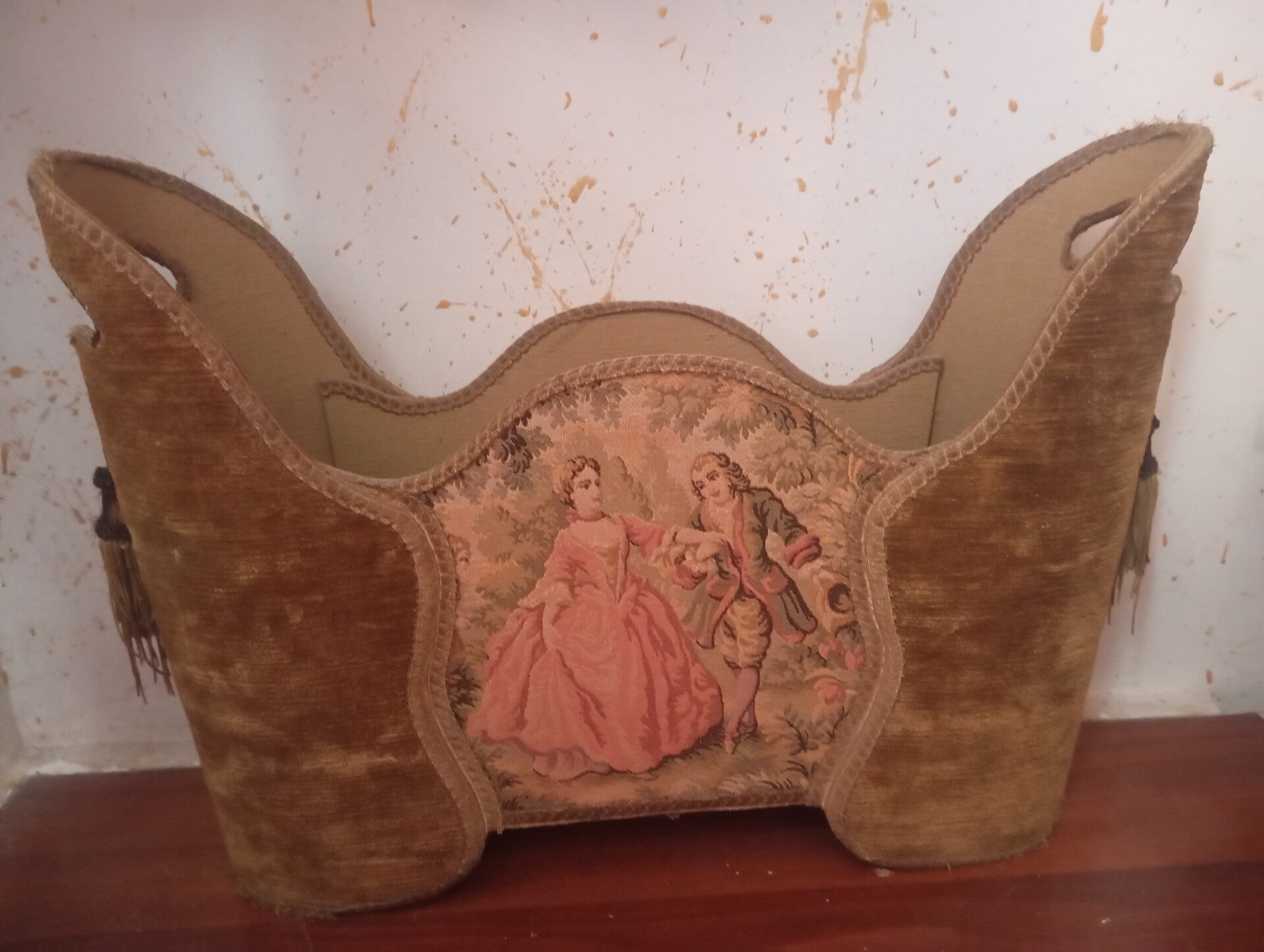 Porta riviste vintage anni 50/70 struttura in legno con lavorazione arazzo. Misure lunghezza 50 altezza 38 profondità 14.