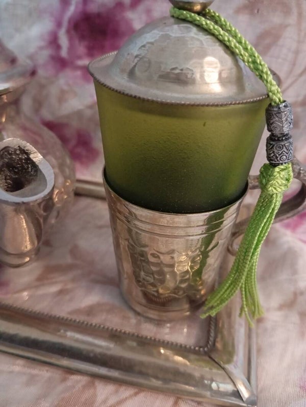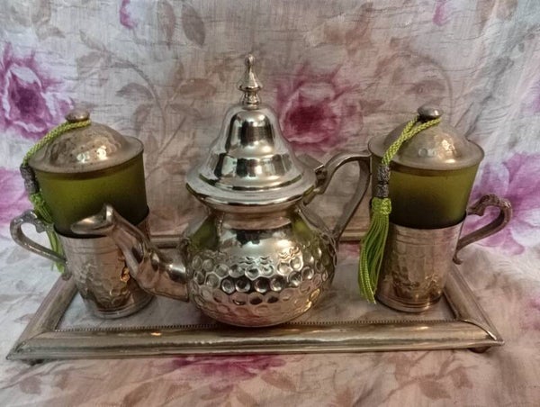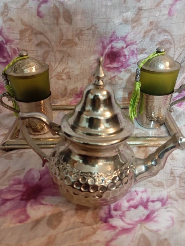 Splendida ed elegante teiera completa di teiera n 2 bicchieri in vetro con coperchio e n 1 vassoio in vetro. Marca ROYAL Nour Garantie.