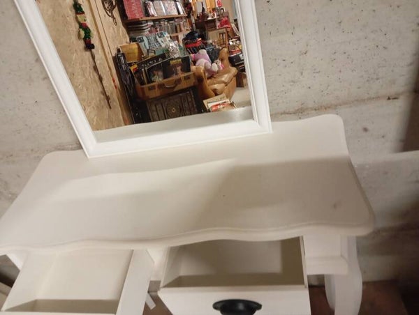 Simpatica consolle completa di cassettiera, pouf e specchio, riverniciata stile shabby.