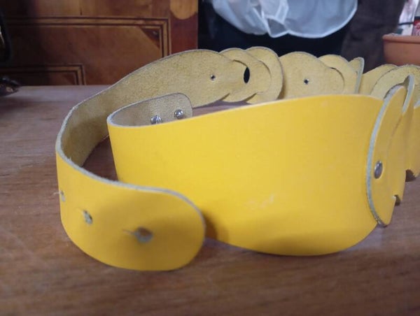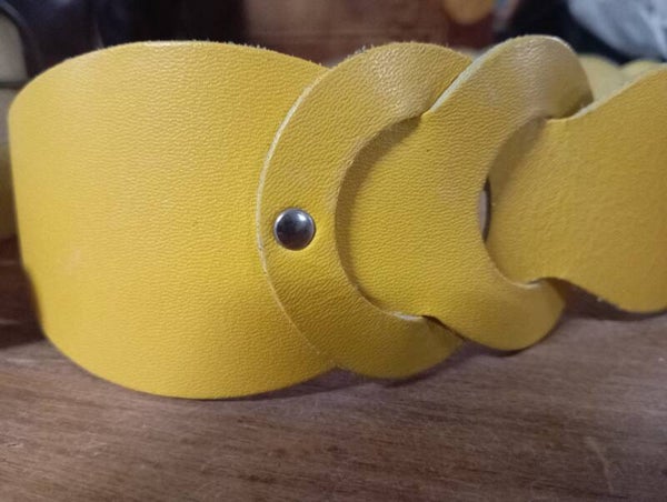 Cinta in pelle lavorazione artigianale colore giallo con un intreccio nella parte posteriore della cinta misura lunghezza 1.03.