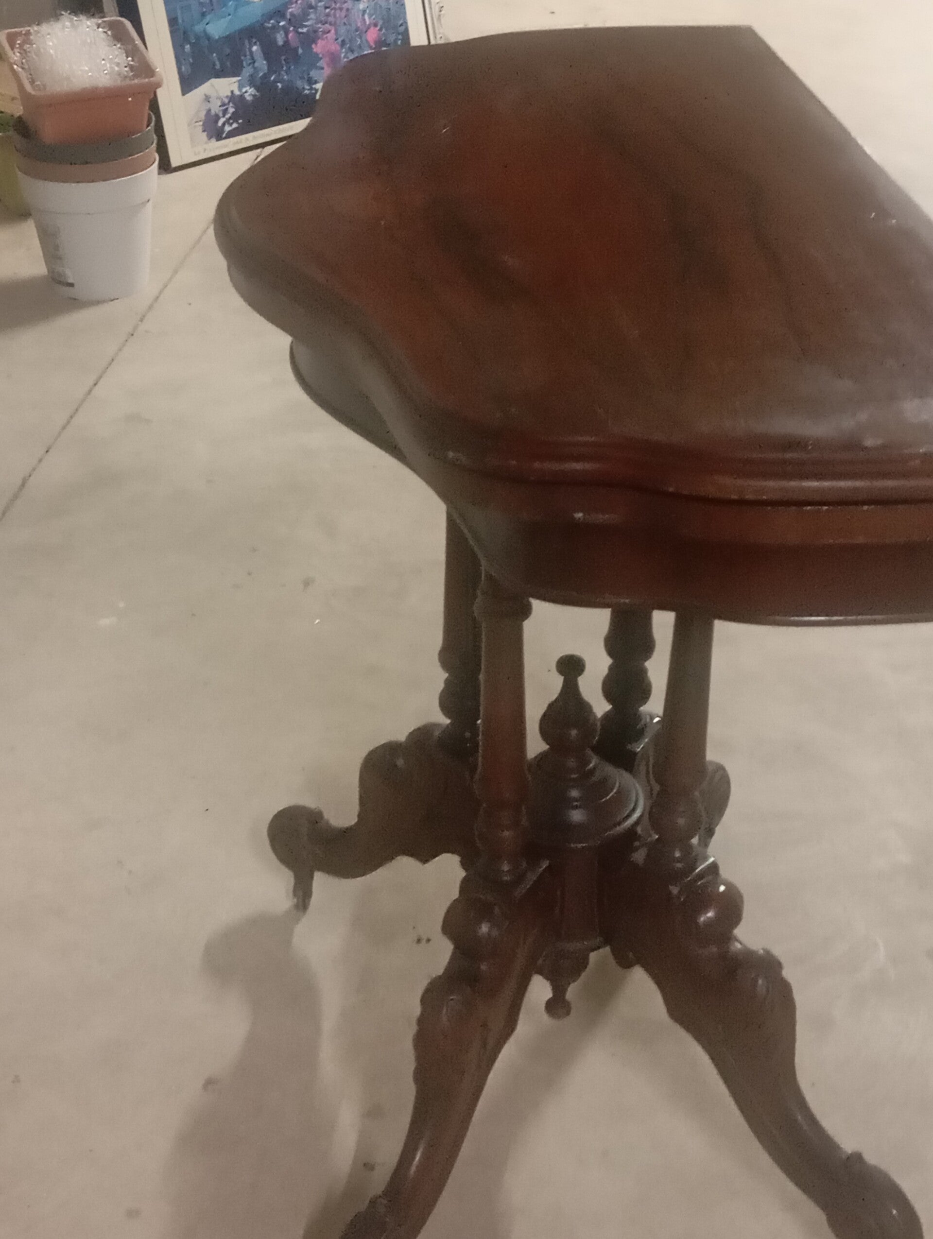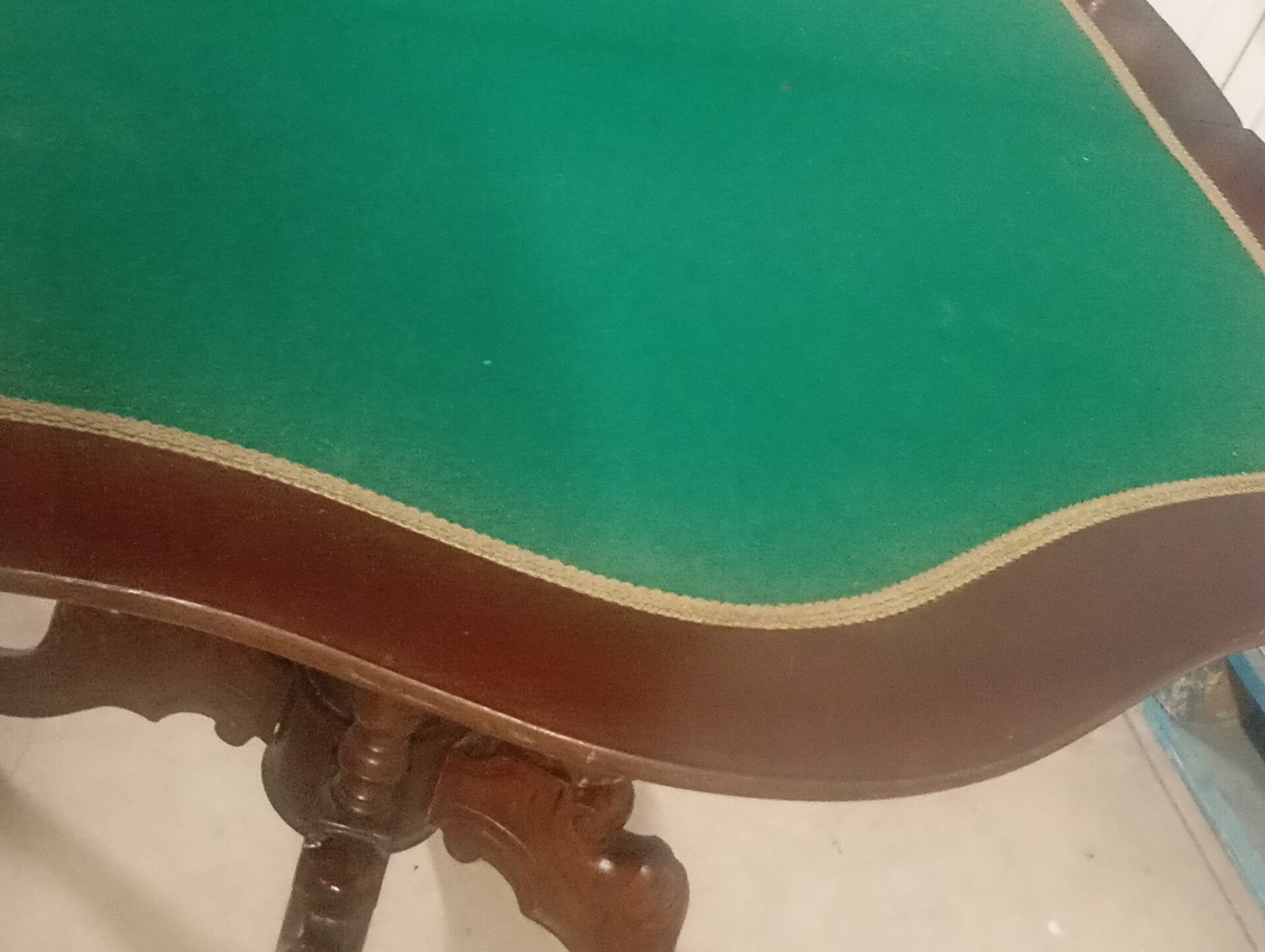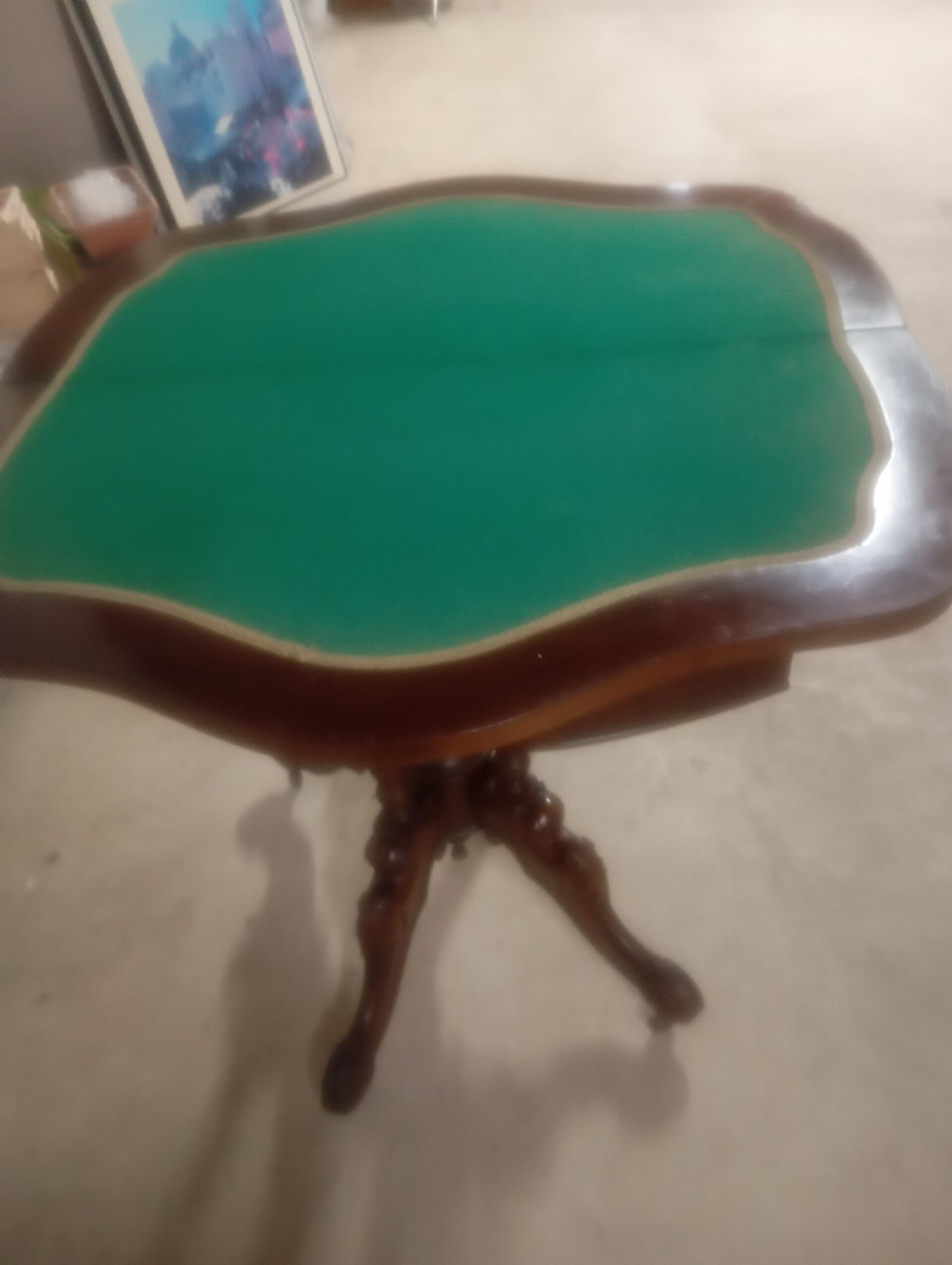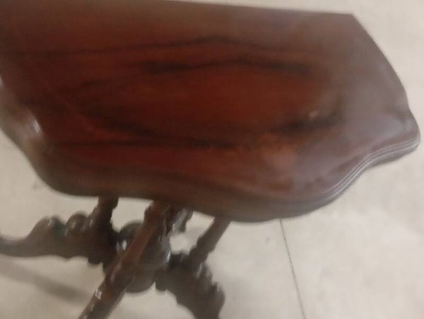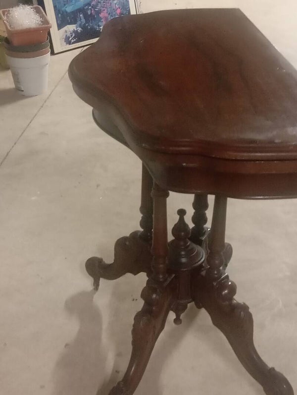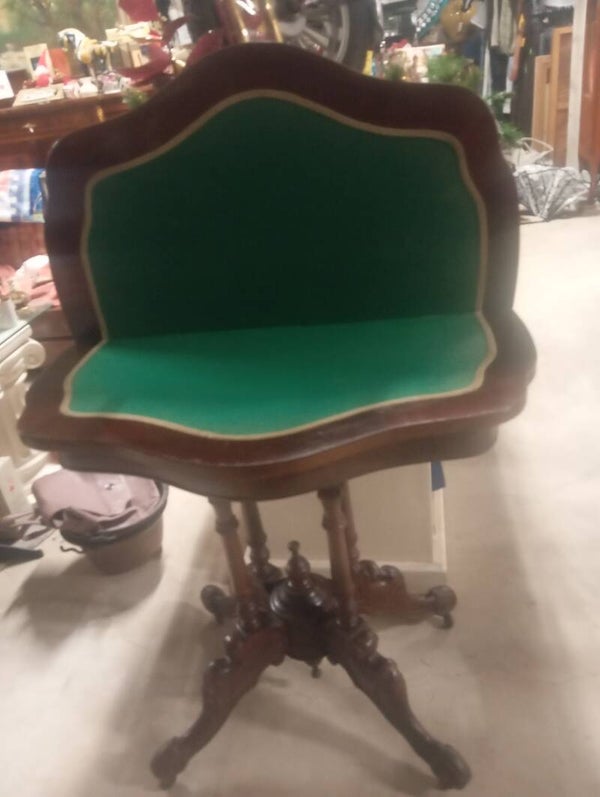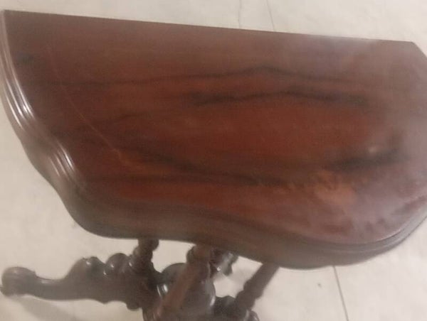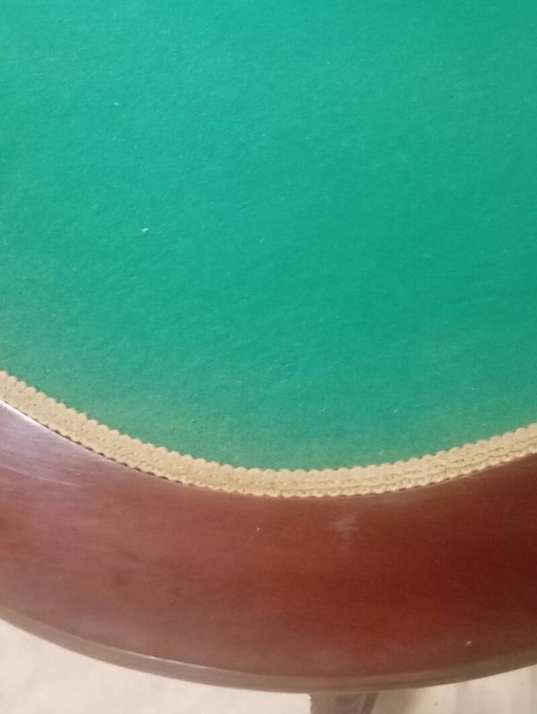 Splendido tavolino da gioco con gambe intarsiate. Ottime condizioni pari al nuovo. Misure diametro chiuso 44 aperto 88 altezza 76.
