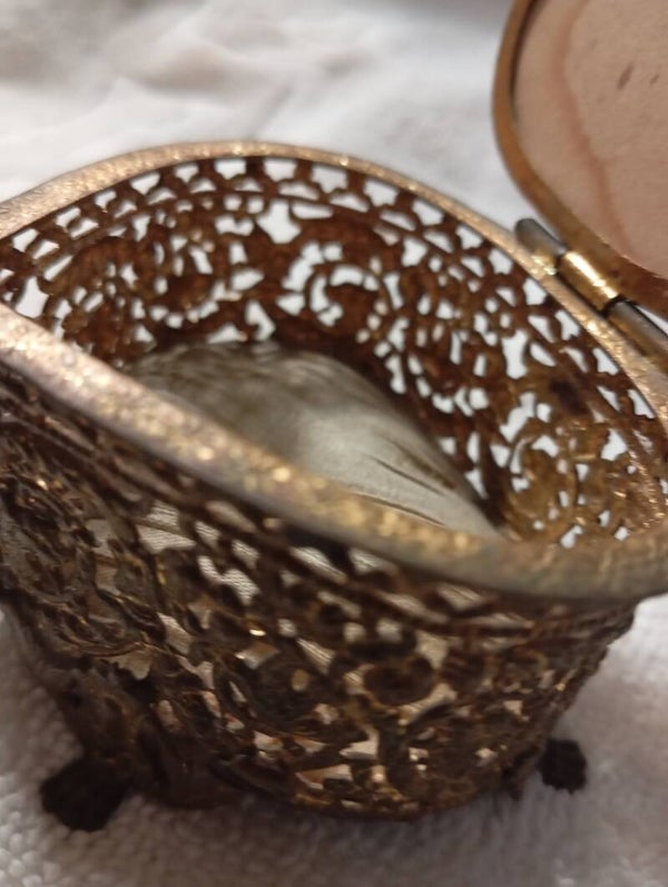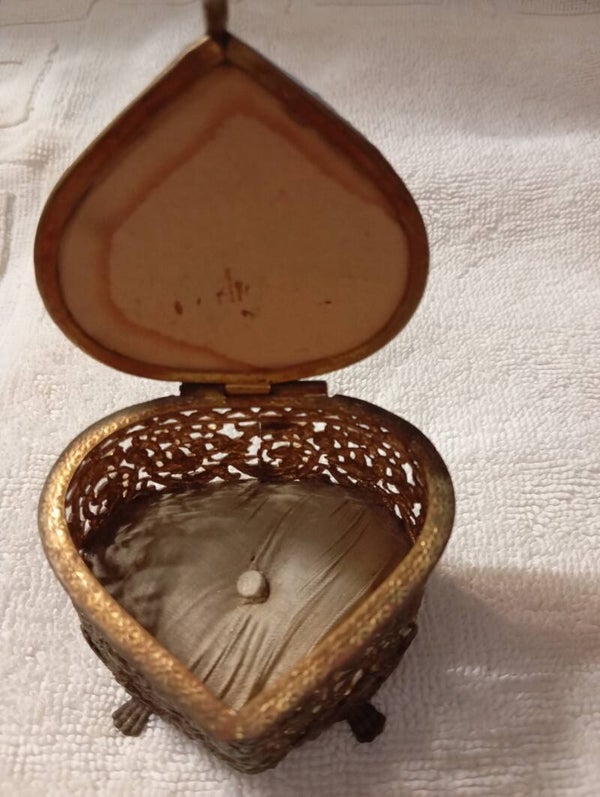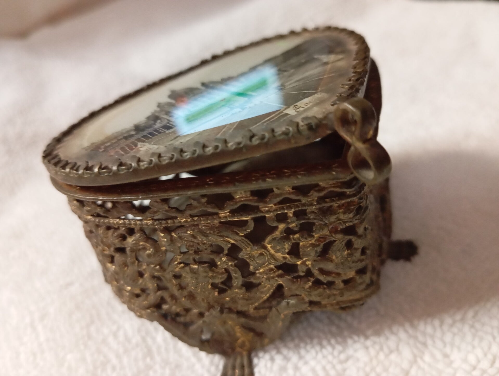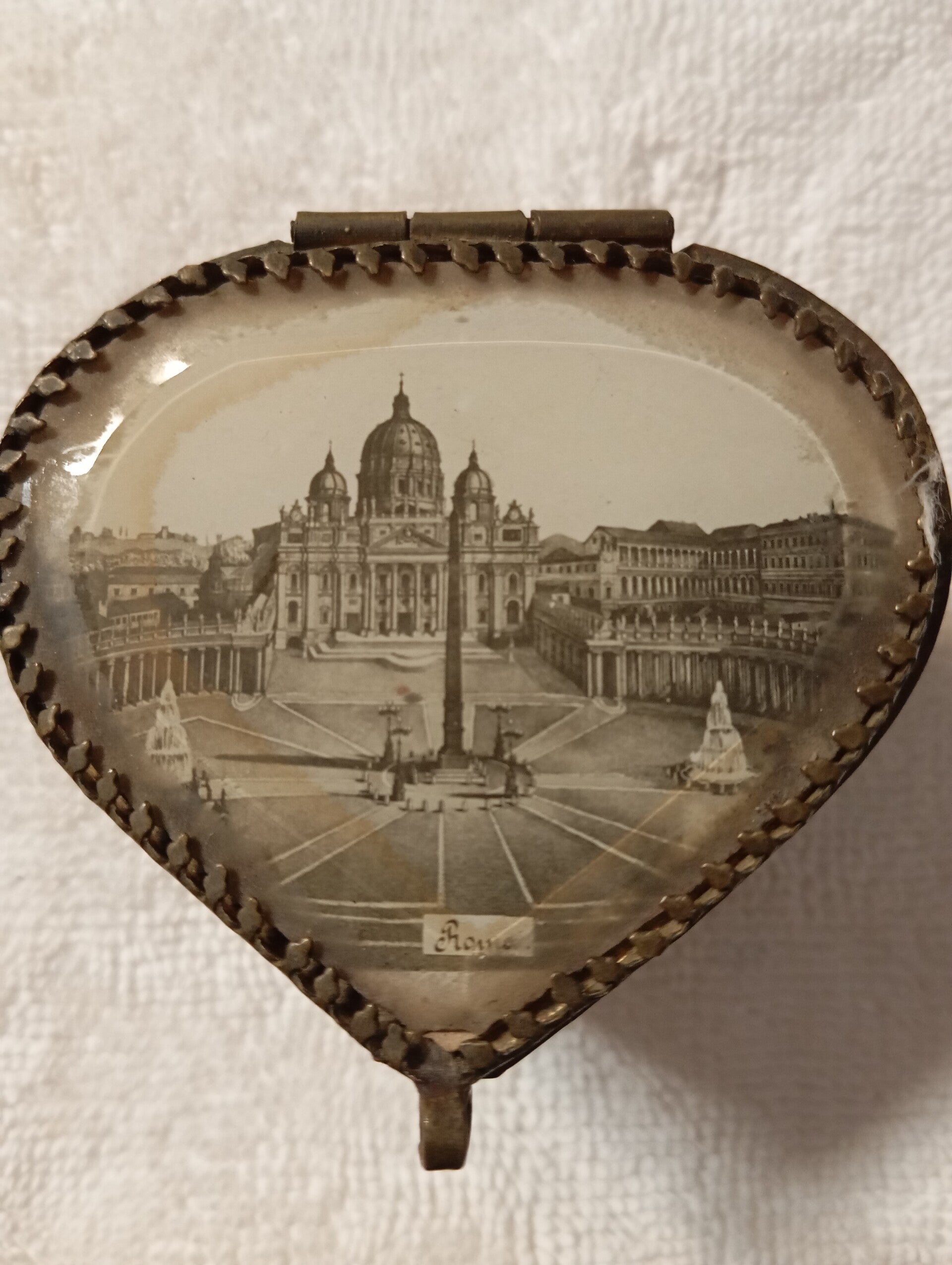 Porta gioie a forma di cuore in metallo traforato, con sopra immagine di Roma s.pietro.