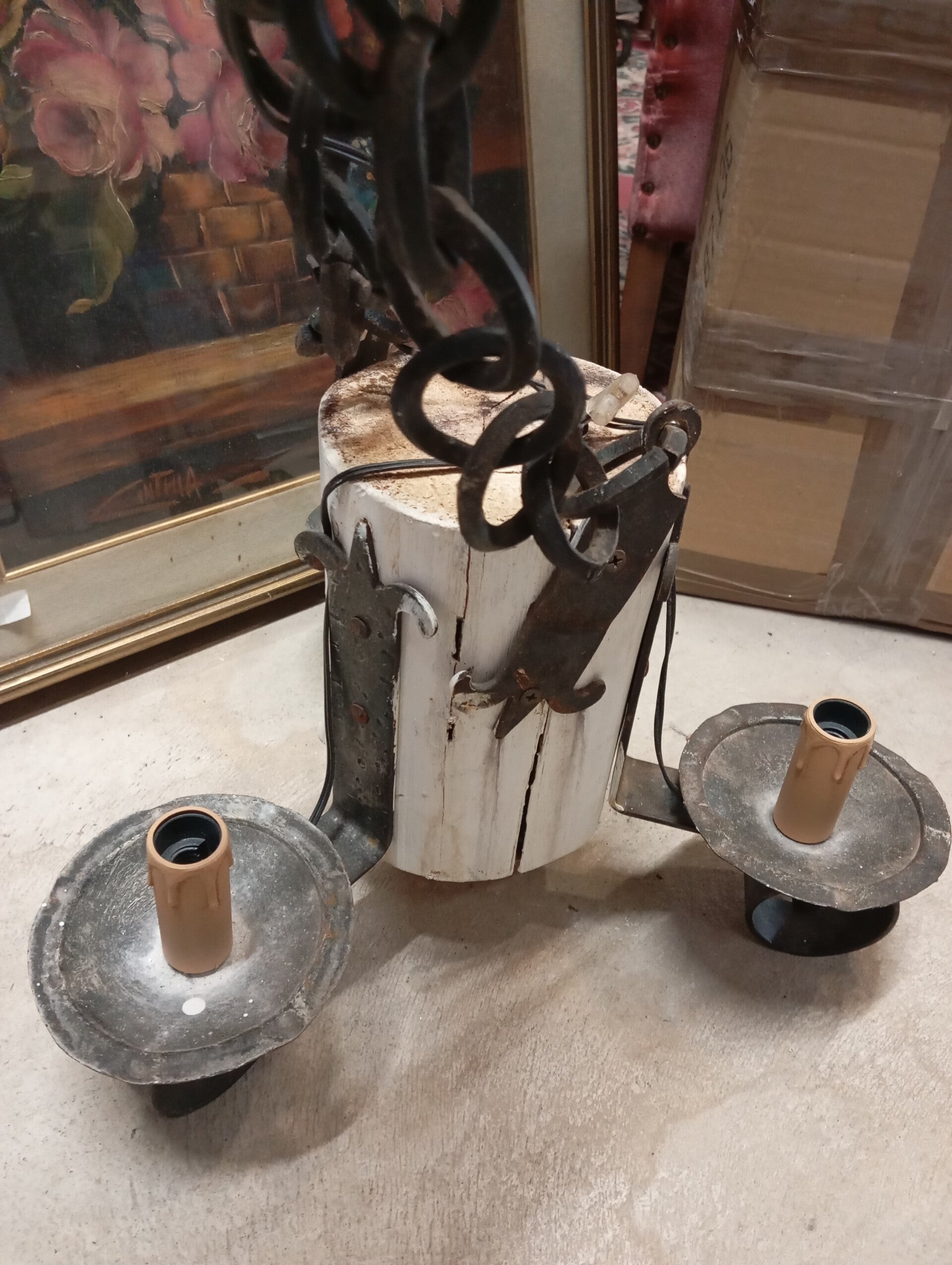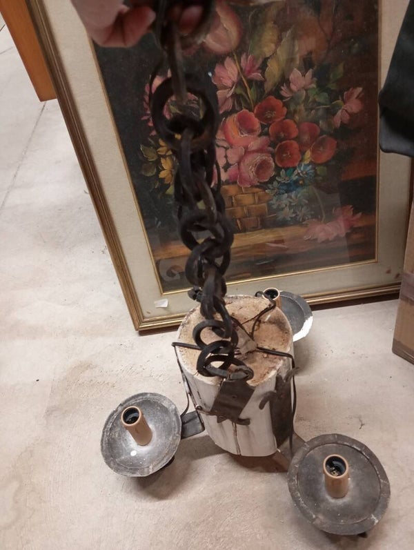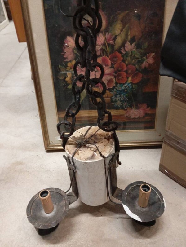 Lampadario in ferro battuto e legno rivisitato. Ottime condizioni.