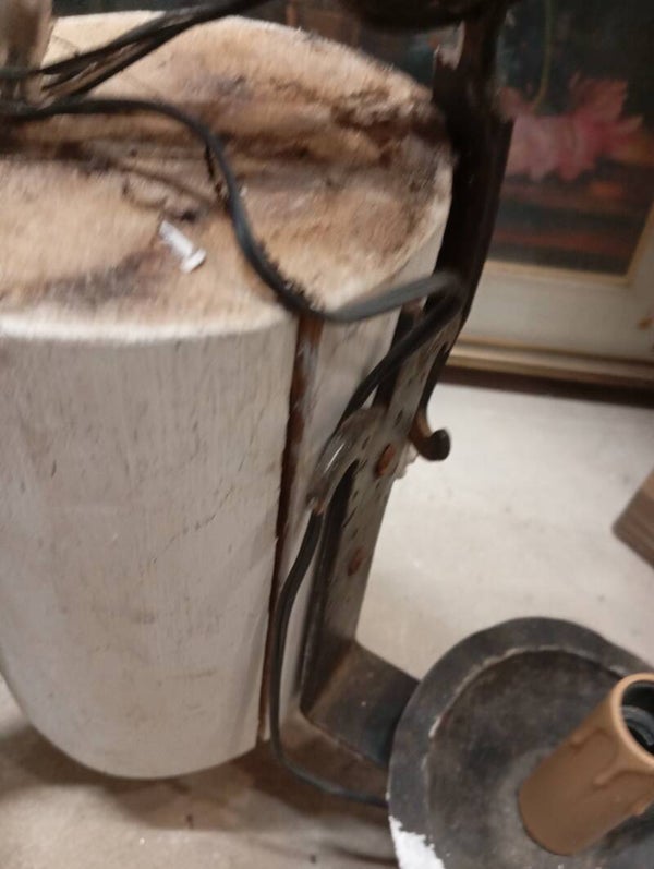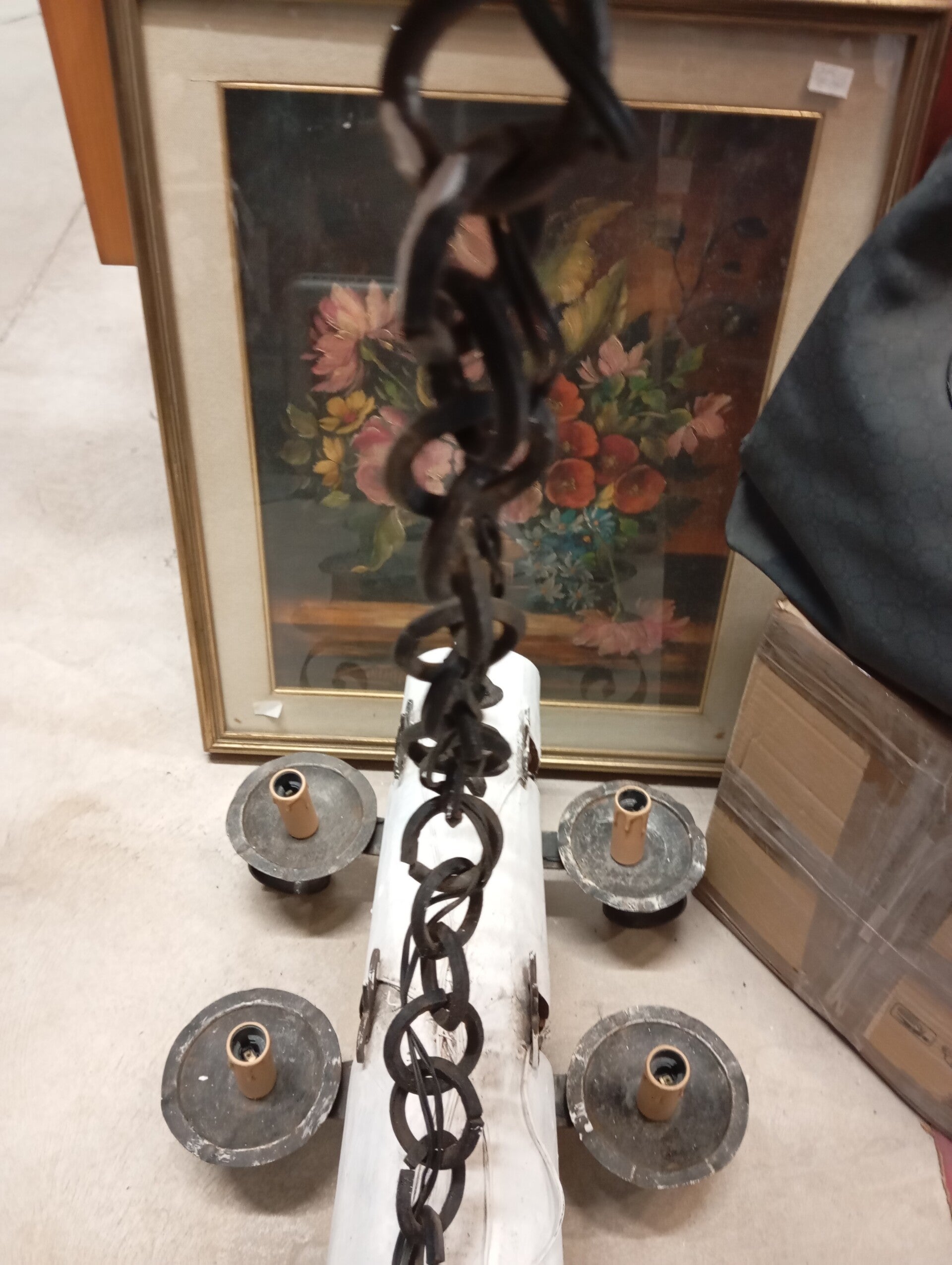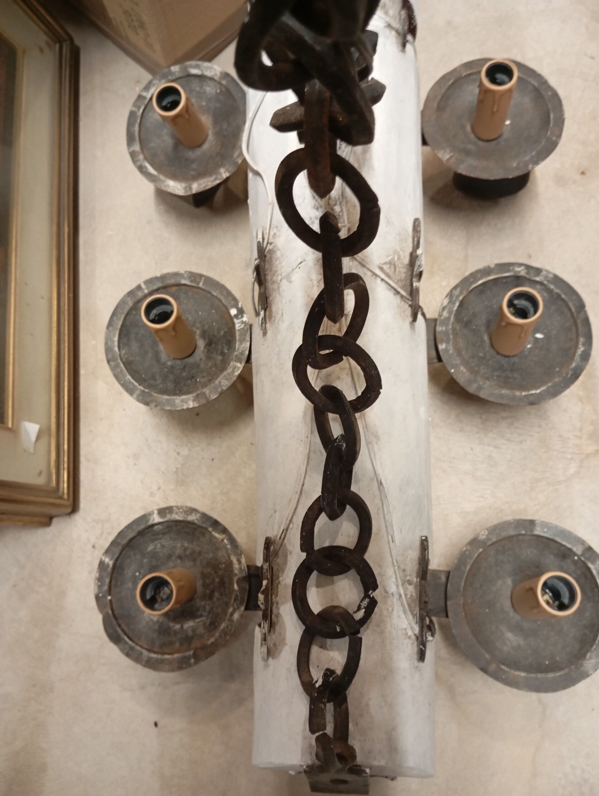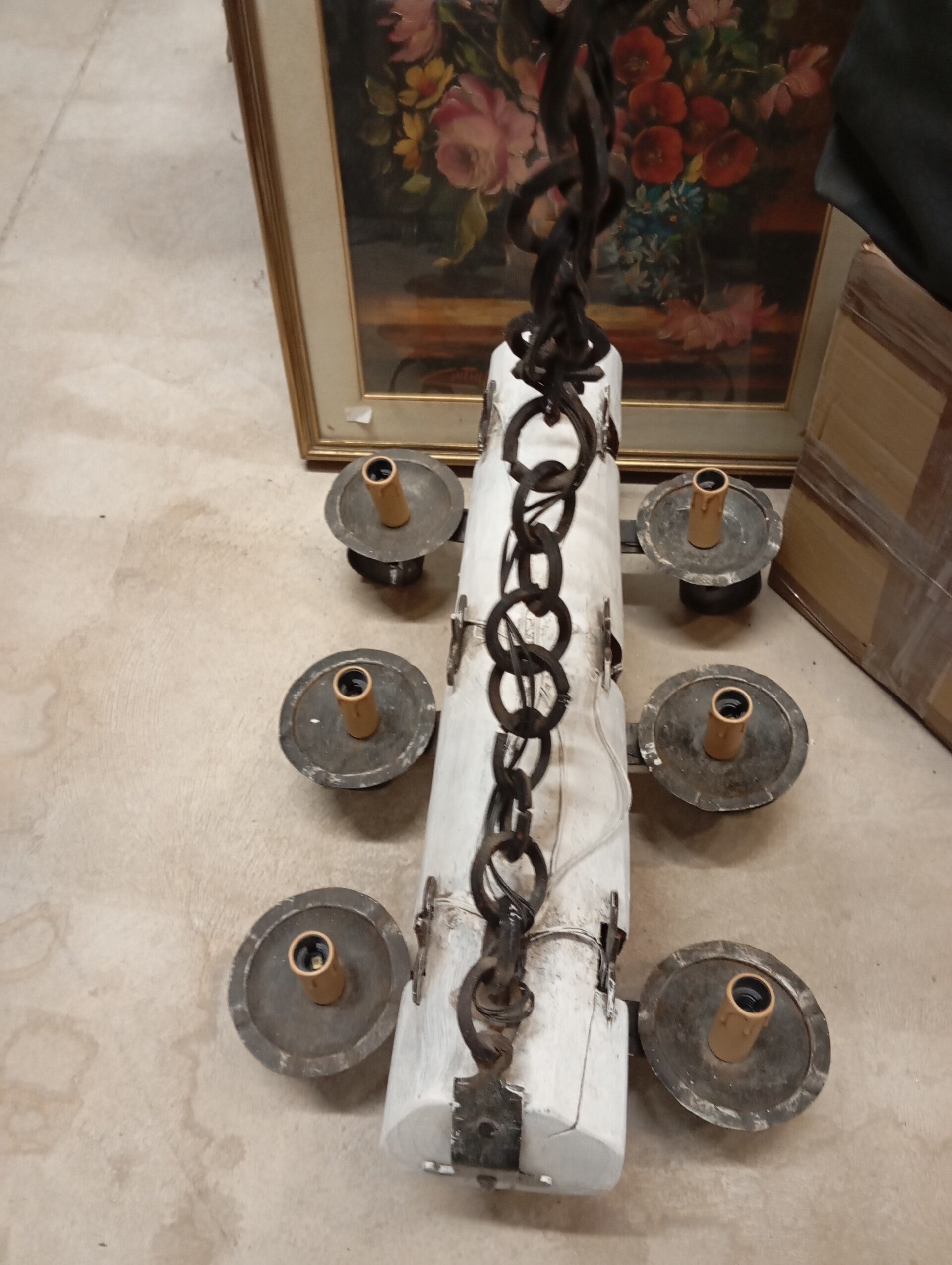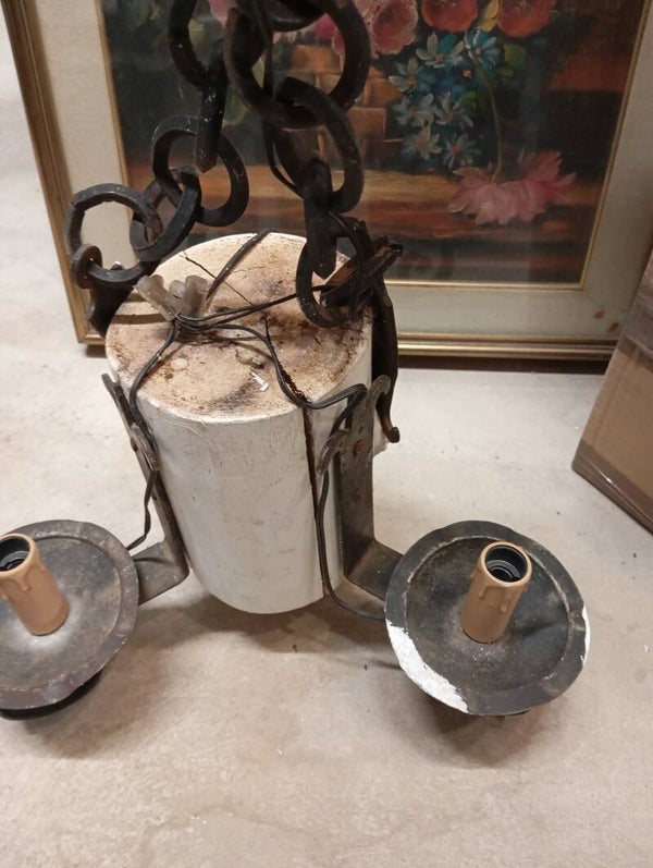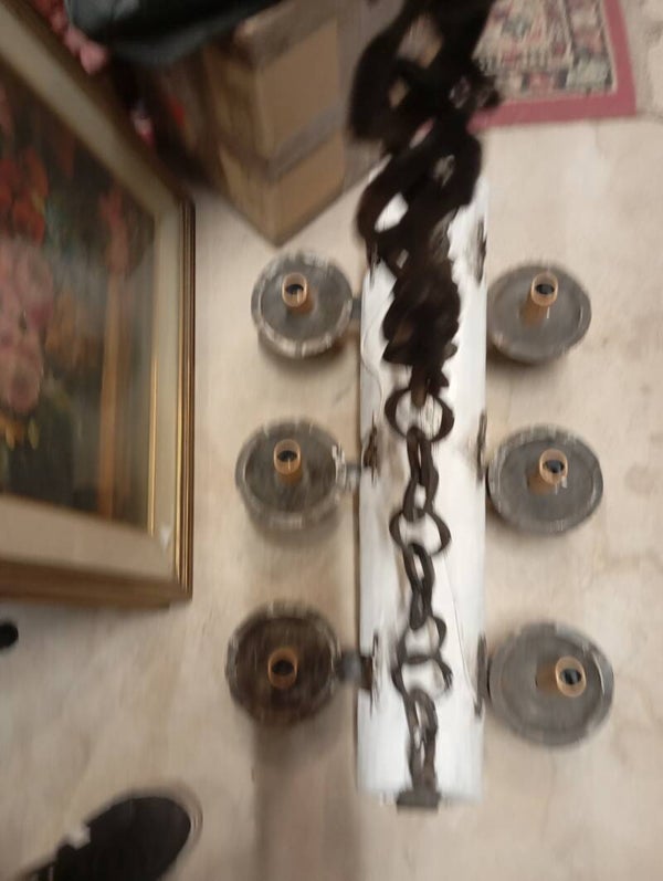 Lampadario a 6 braccia in legno rivisitato e ferro battuto. Ottime condizioni